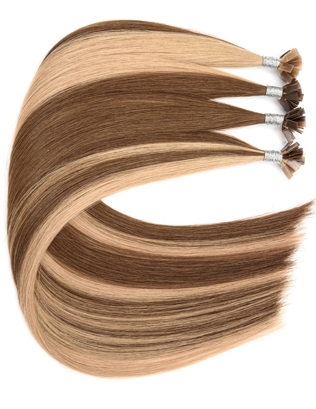 Die Flat-förmigen Bondings Haarverlängerung werden mit der Wärmezange oder dem Ultraschallgerät von außen erwärmt und können mit dieser Methode 6 Monate und länger halten.