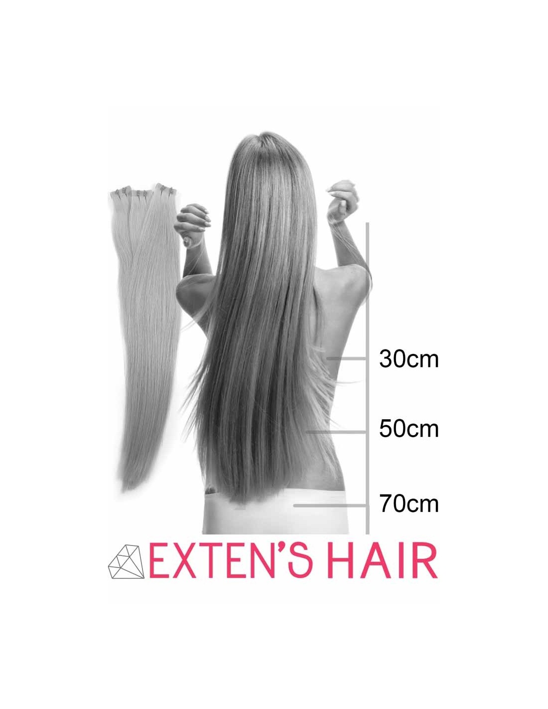Extens Hair hat Keratin-Extensions in verschiedenen Längen: 30 cm für mittellanges Haar, 40 cm, 50 cm und sogar 70 cm für richtig langes XXL-Haar.