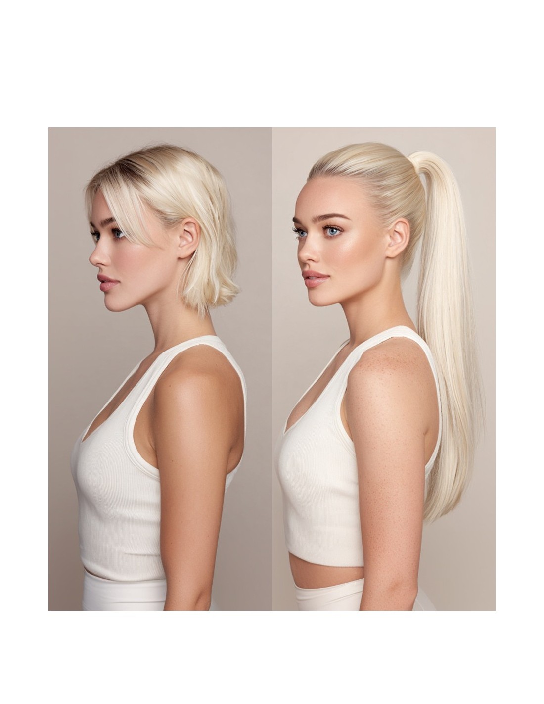 Du machst einfach deinen Basic-Zopf, klippst die Extension mit ihrem hyper-diskreten System rein, und boom! Du hast sofort diese Traum-Mähne, lang und strahlend, die alle Blicke auf sich zieht. Das Platinblond in dieser Länge ist praktisch unmöglich natürlich zu bekommen, ohne die Haare zu zerstören - während es hier von der Wurzel bis zu den Spitzen perfekt ist.
