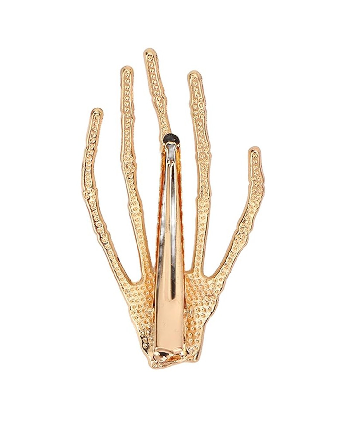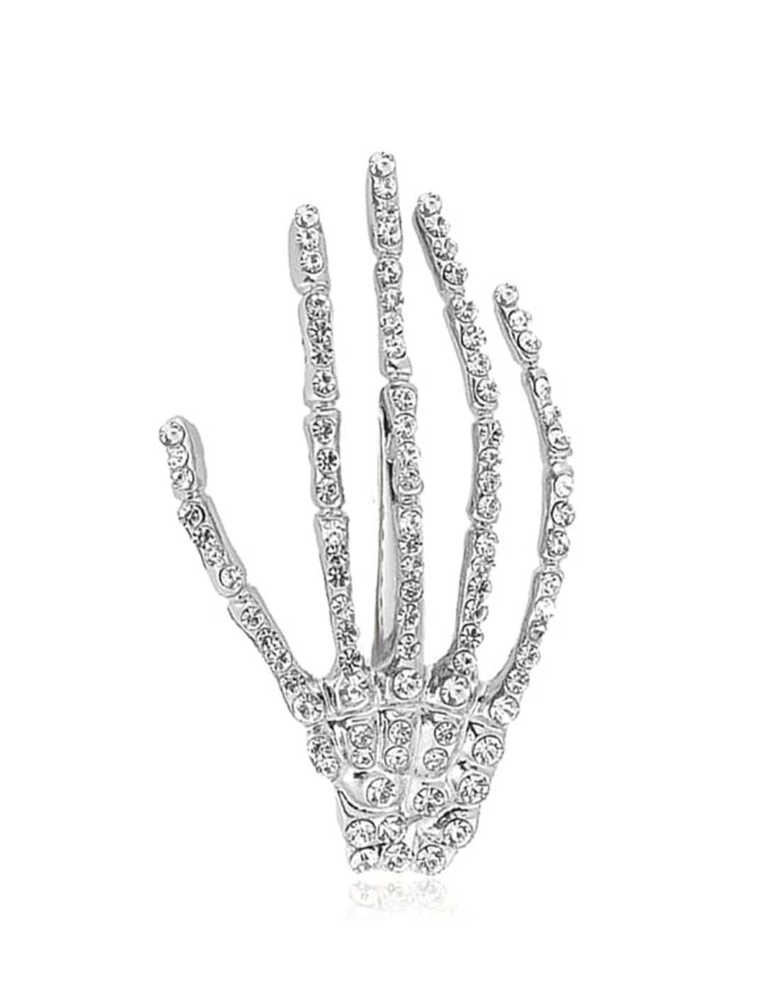 Die „Hand“-Silhouette liefert sofort wiedererkennbaren Style: goth chic, glam rock oder Halloween-Kostüm – alles passt. Die Strasssteine fangen bei jeder Bewegung das Licht ein und erzeugen einen Wow-Effekt. Erhältlich in Gold oder Silber je nach Outfit.