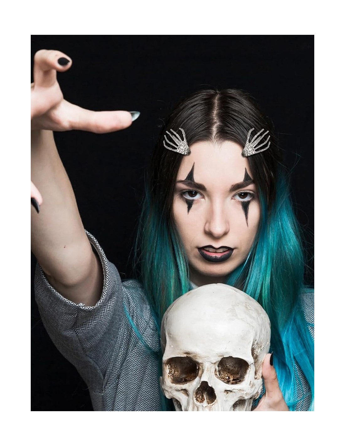 Statement-Accessoire für Halloween und darüber hinaus: Die Skelett-Hand Haarspange vereint strahlende Strasssteine mit zuverlässigem Halt. Die knöcherne Form greift die Strähne, ohne sie zu brechen, während die facettierten Steine bei jeder Bewegung Licht einfangen. Die leichte Metalllegierung bleibt von Anfang bis Ende der Party bequem. Vielseitig einsetzbar in wenigen Sekunden – als Half-Up, Seitensträhne oder lockerer Dutt. Geeignet für glattes oder texturiertes Haar und kompatibel mit Extensions und Perücken. Sprays nicht direkt auf die Spange geben; mit einem weichen Tuch trocken abwischen und vor Feuchtigkeit geschützt lagern, um den Glanz zu erhalten. Eine einfache, wirkungsvolle und visuelle Lösung, um ohne Aufwand in den „glam goth“-Modus zu wechseln.