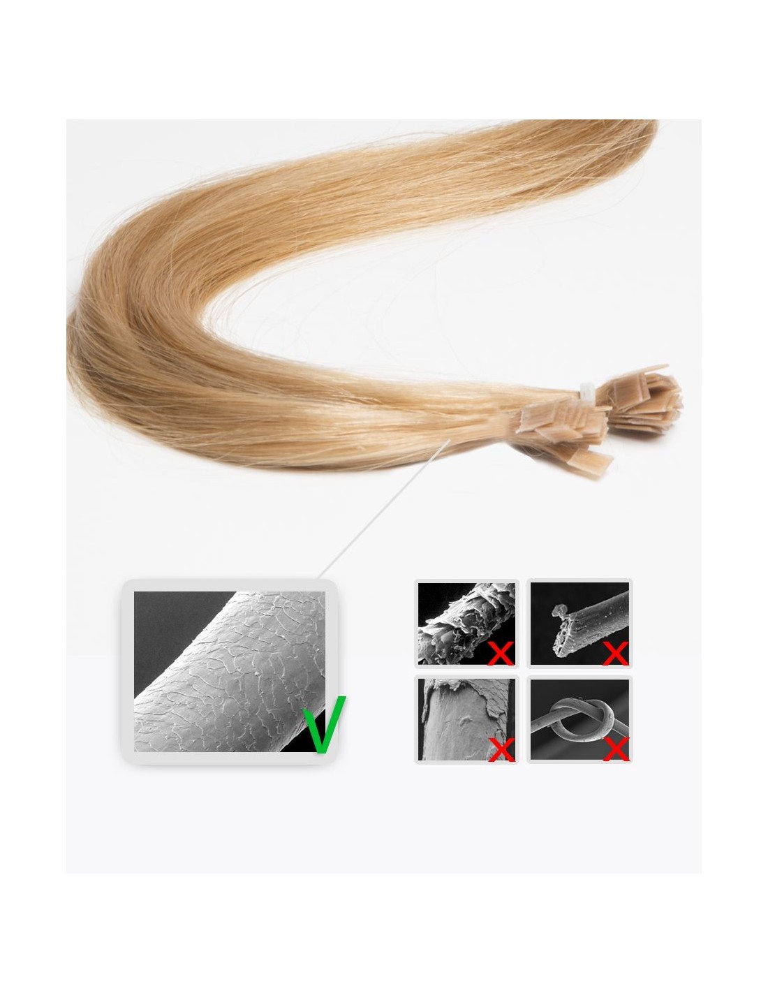 Les mèches d'extension à chaud du site d'extension Extens-Hair sont faites de cheveux indiens 100% remy hair avec cuticule intacte de grade AAAAA. C'est la qualité professionnelle vendue par les grandes marques de l'extension de cheveux dans les salons de coiffure.