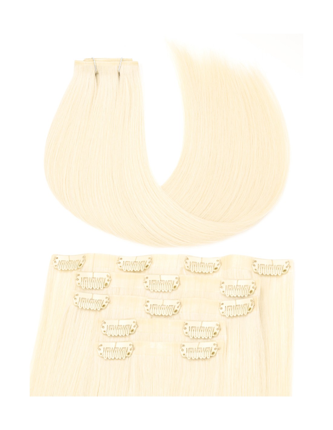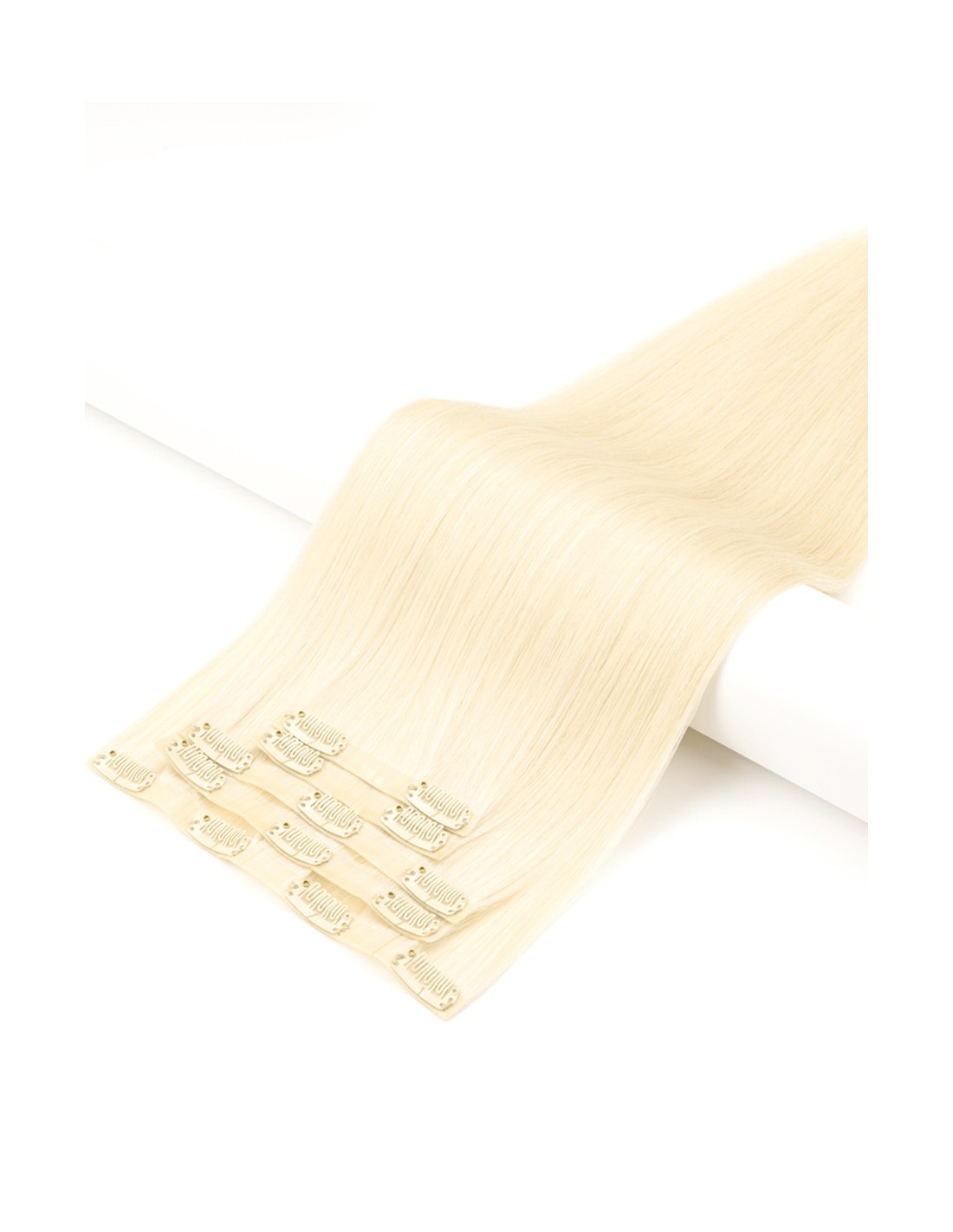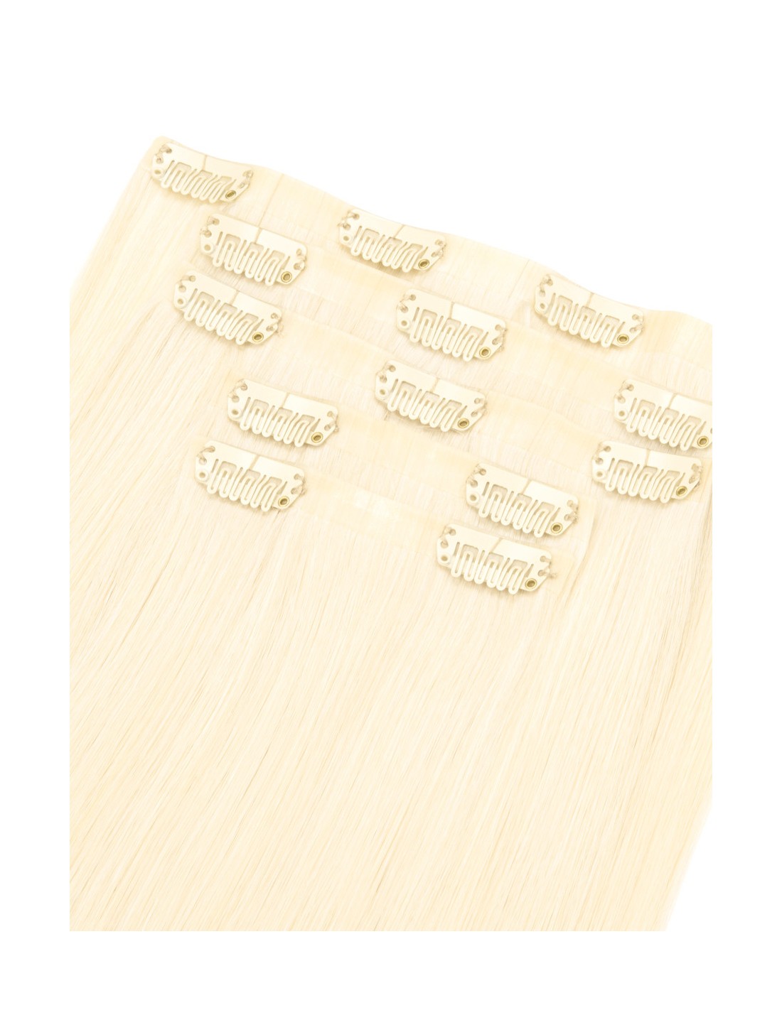 110 gr d'extensions à clip en cheveux naturels lisses couleur blond platine, longueur 50 cm. 5 bandes à clip pour changer de tête en 5 min. L'extension de cheveux à clip est garantie 100% remy hair et cheveux naturels. Nos Extension à clip sont sans couture pour plus de confort et de discrétion.