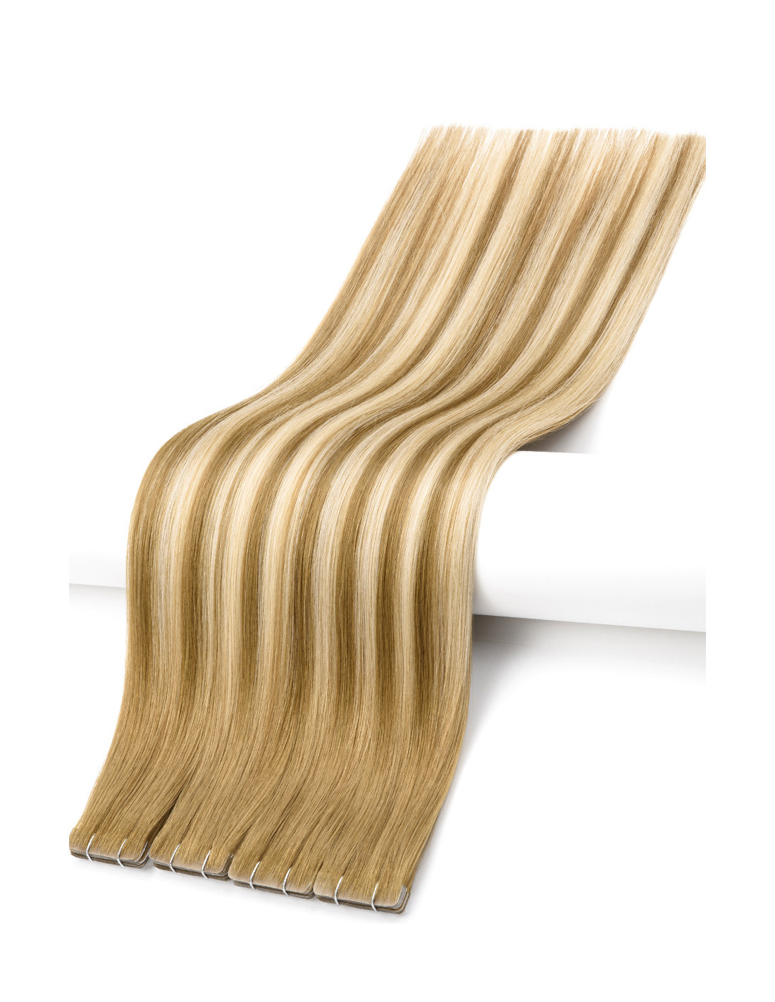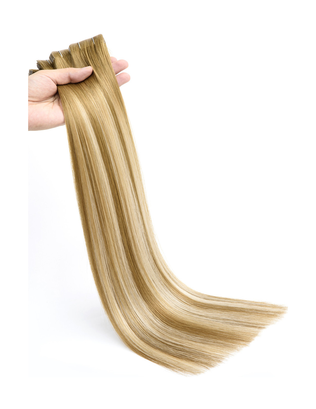 Fabriquées en cheveux naturels Remy à cuticule intacte, ces tape hair injectées assurent un toucher soyeux, une brillance naturelle et zéro emmêlement. Chaque paquet contient 10 mèches adhésives (5 sandwiches) de 4 cm de large, 25 g, avec des pointes bien fournies (ratio 30) pour un fondu parfait entre les teintes brunes et blondes sur toute la longueur.