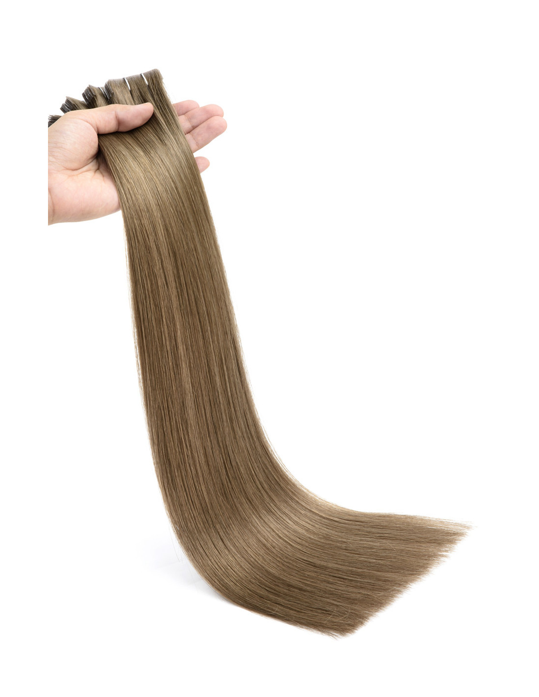L'extension injectée Brun Clair Cendré Tape Hair 9A de 50 cm dévoile un brun clair aux nuances cendrées froides, idéal pour un rendu discret et naturel qui s'intègre sans effort entre un châtain et un blond foncé. Chaque mèche est injectée directement dans une bande de polyuréthane ultrafine et transparente, sans nœud ni épaisseur visible — la fixation devient invisible, même au toucher.