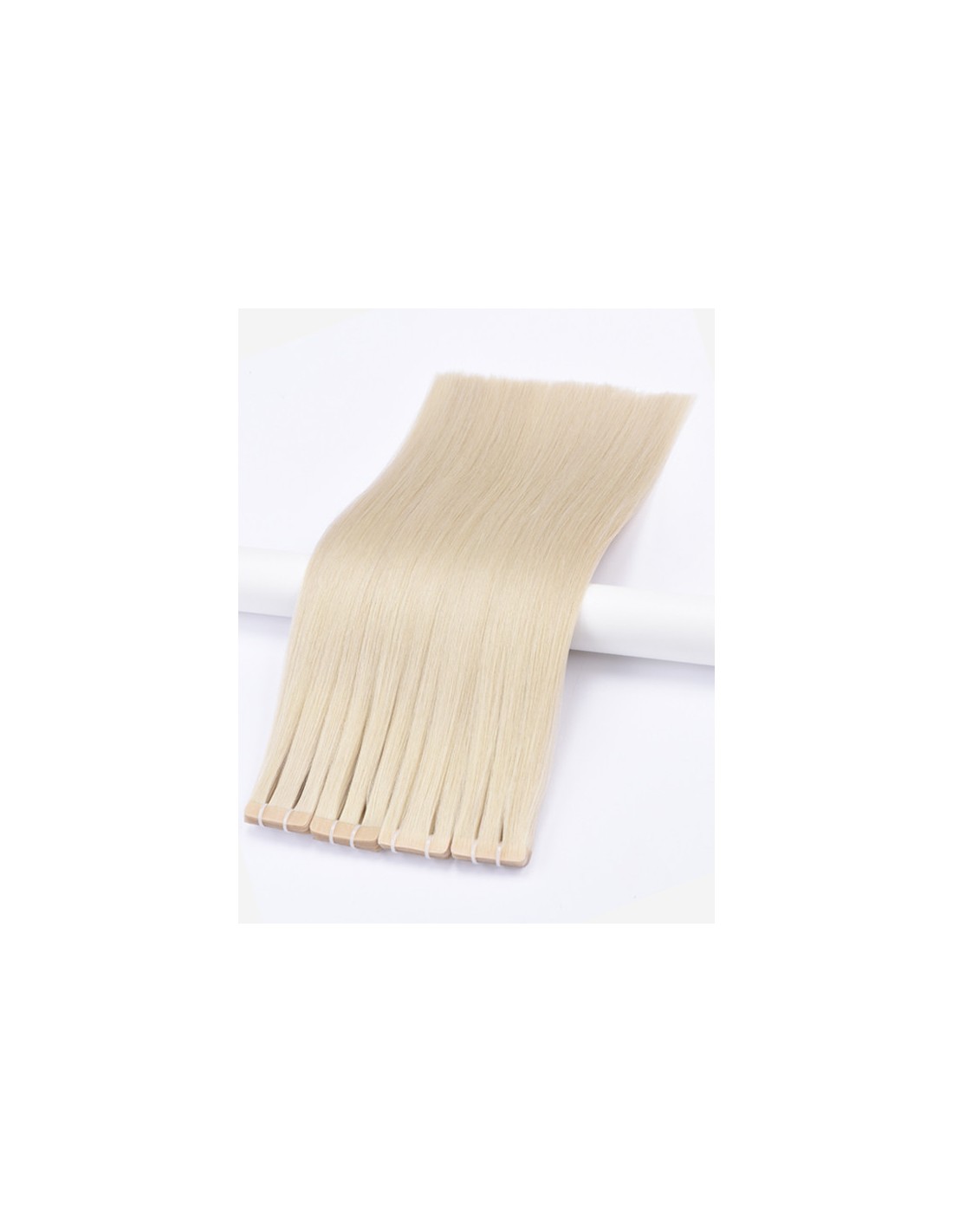 La méthode d’extensions adhésives en cheveux Pure White 70 est la meilleure méthode de pose pour rallonger ou donner du volume à votre chevelure décolorée sans l’abîmer. Nos extensions adhésives sont très discrètes grâce à la technologie injectée. Les extensions se réutilisent et se remontent toutes les 6 à 8 semaines selon la repousse de vos cheveux naturels. Le temps de pose est très rapide, vous pouvez poser une tête entière en moins de 45 minutes. Chaque paquet d'extension comprend 10 bandes simples, ce qui fait cinq bandes doubles à coller ensemble.