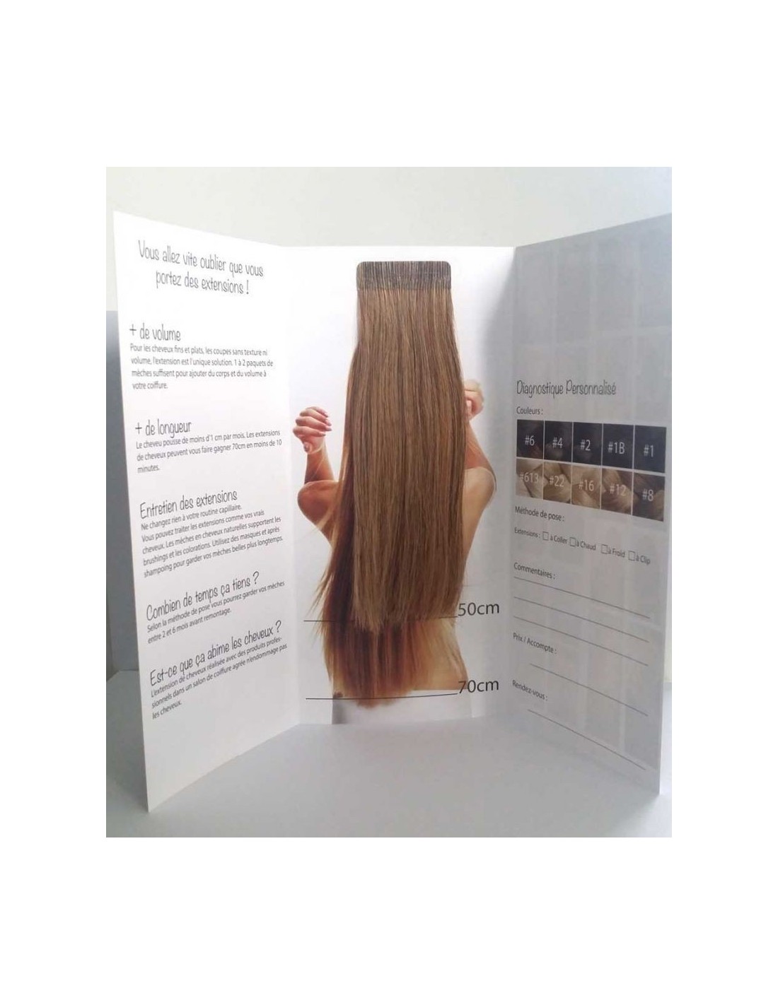 - Des dépliants publicitaires pour vous aider à promouvoir la pose d'extensions de cheveux auprès de vos clientes. Ces dépliants sont neutre de marque, et vous permette de faire un devis.
