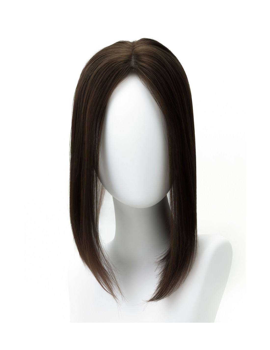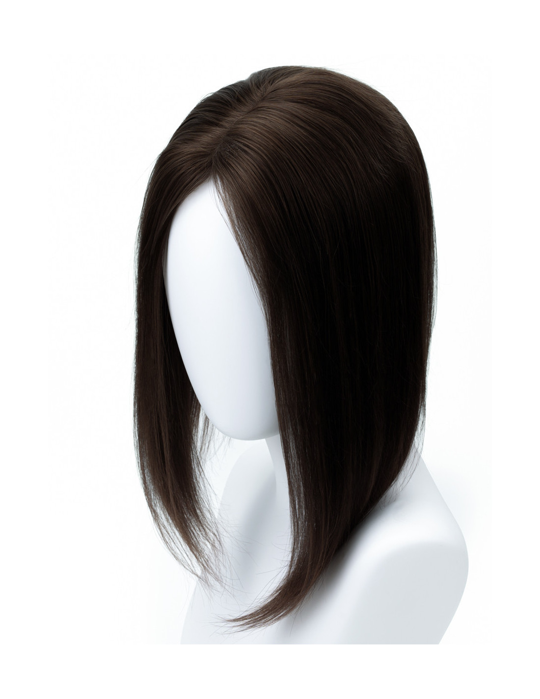 Ce hair topper brun foncé est une solution légère et confortable pour densifier le dessus de la tête sans devoir porter une perruque entière.